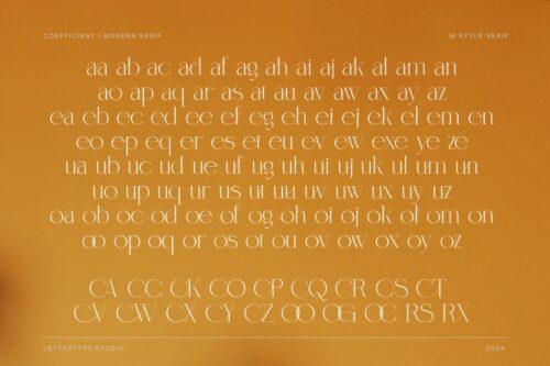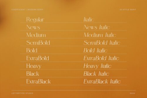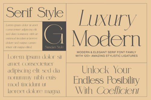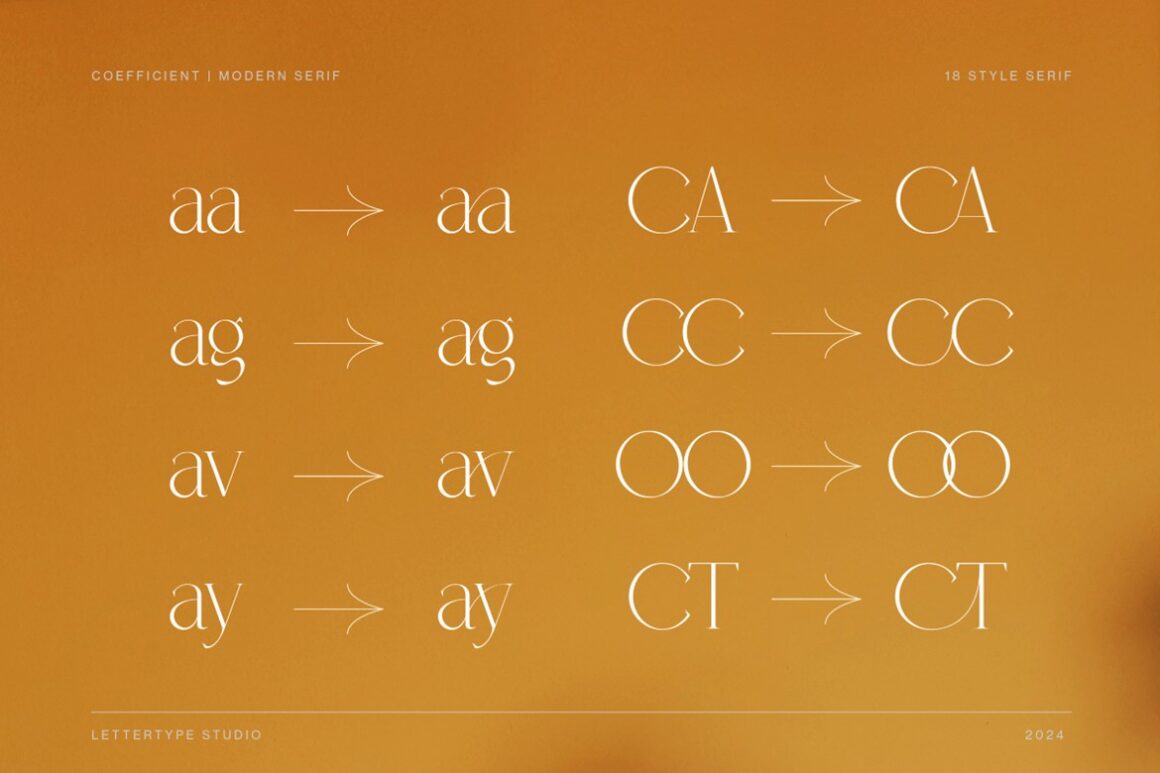 Coefficient is a modern elegant serif font family inspired by 18th-century typography. With 18 styles, 120+ ligatures, and refined geometric details, it offers both sophistication and versatility for professional design work. Its timeless aesthetic makes it ideal for luxury branding and high-end editorial layouts.