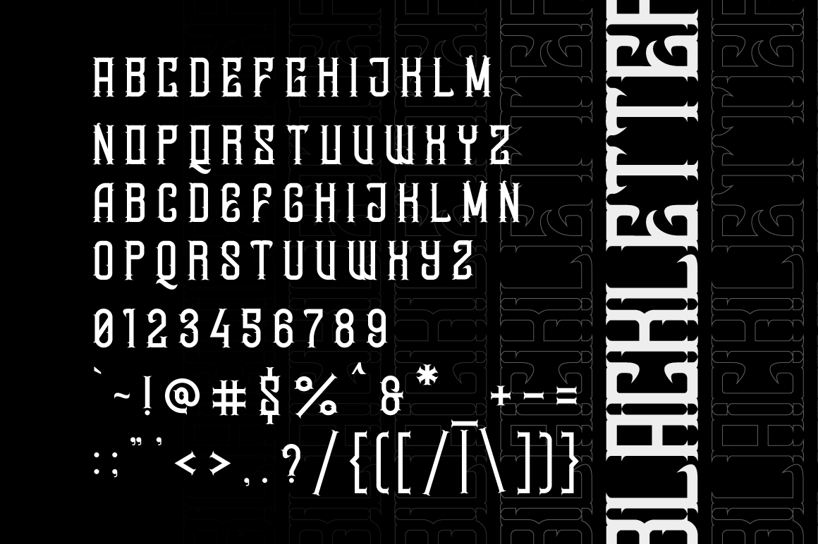 Dwaycome is a gothic blackletter display font that merges historical craftsmanship with bold modern design. Featuring intricate curves and clean symmetry, it evokes the timeless elegance of medieval calligraphy while maintaining contemporary legibility and style.