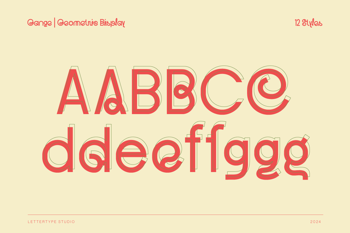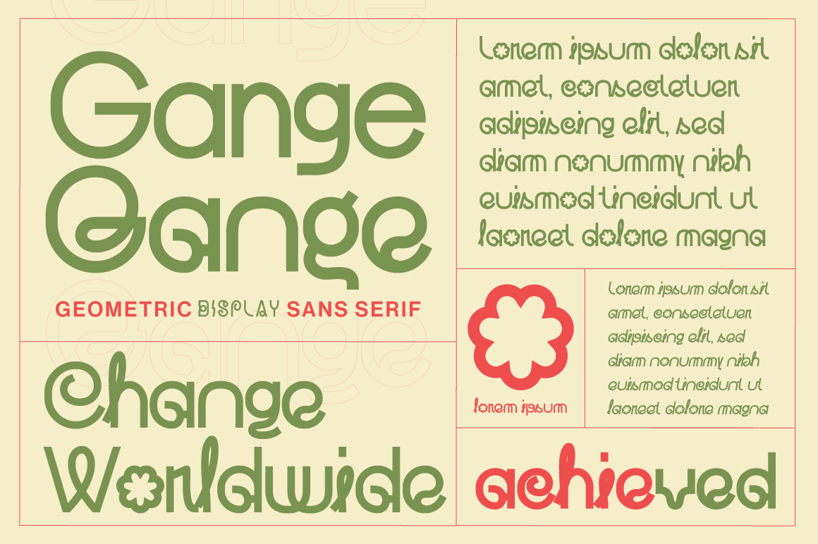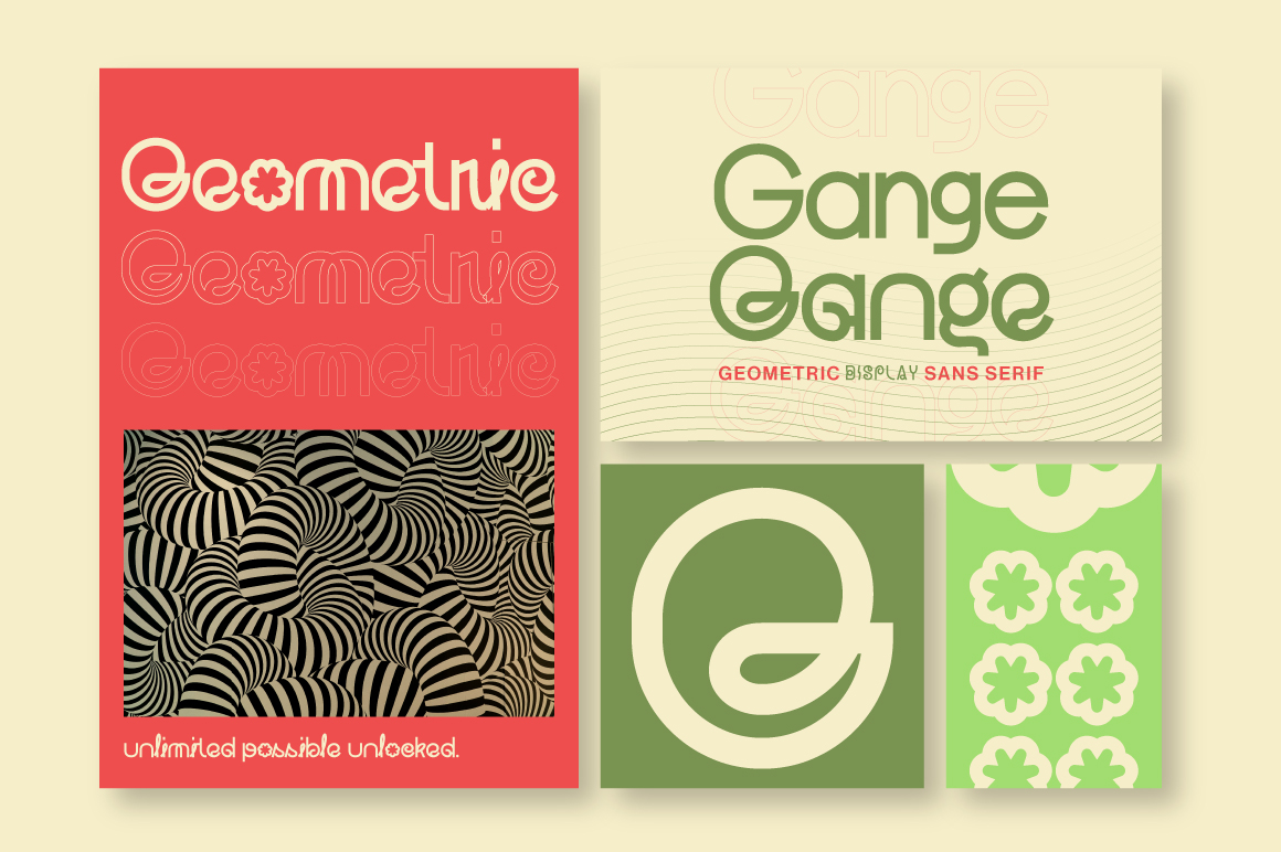 Gange is a geometric display sans serif font designed for creativity and bold expression. With over 57 alternate glyphs and 12 styles, it offers endless customization options to craft unique and standout designs with precision.