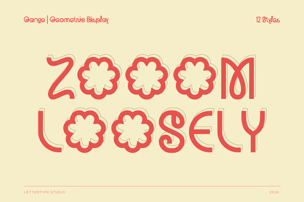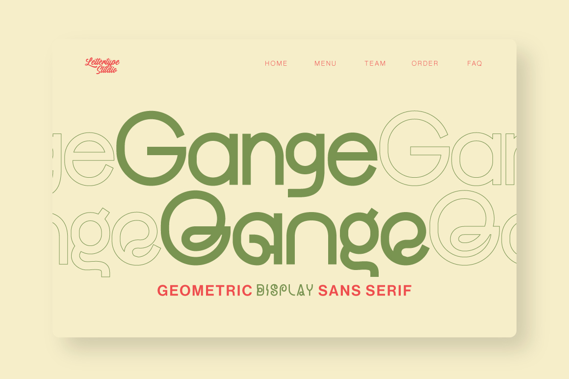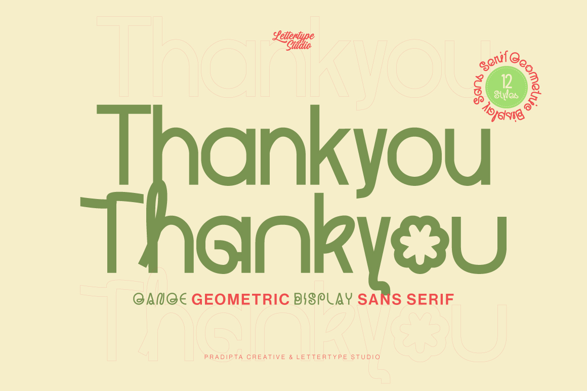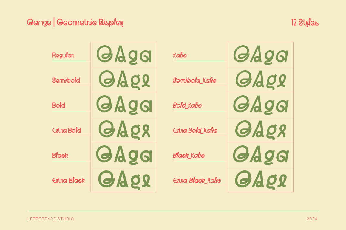 Gange is a geometric display sans serif font designed for creativity and bold expression. With over 57 alternate glyphs and 12 styles, it offers endless customization options to craft unique and standout designs with precision.
