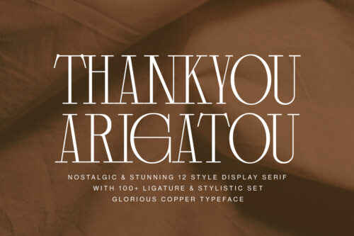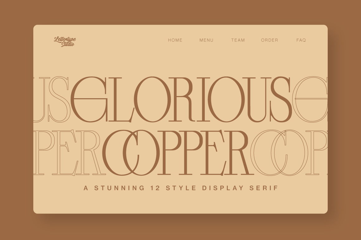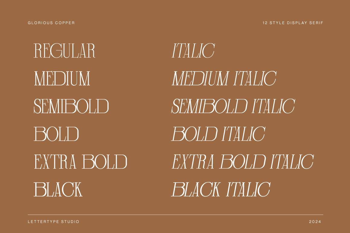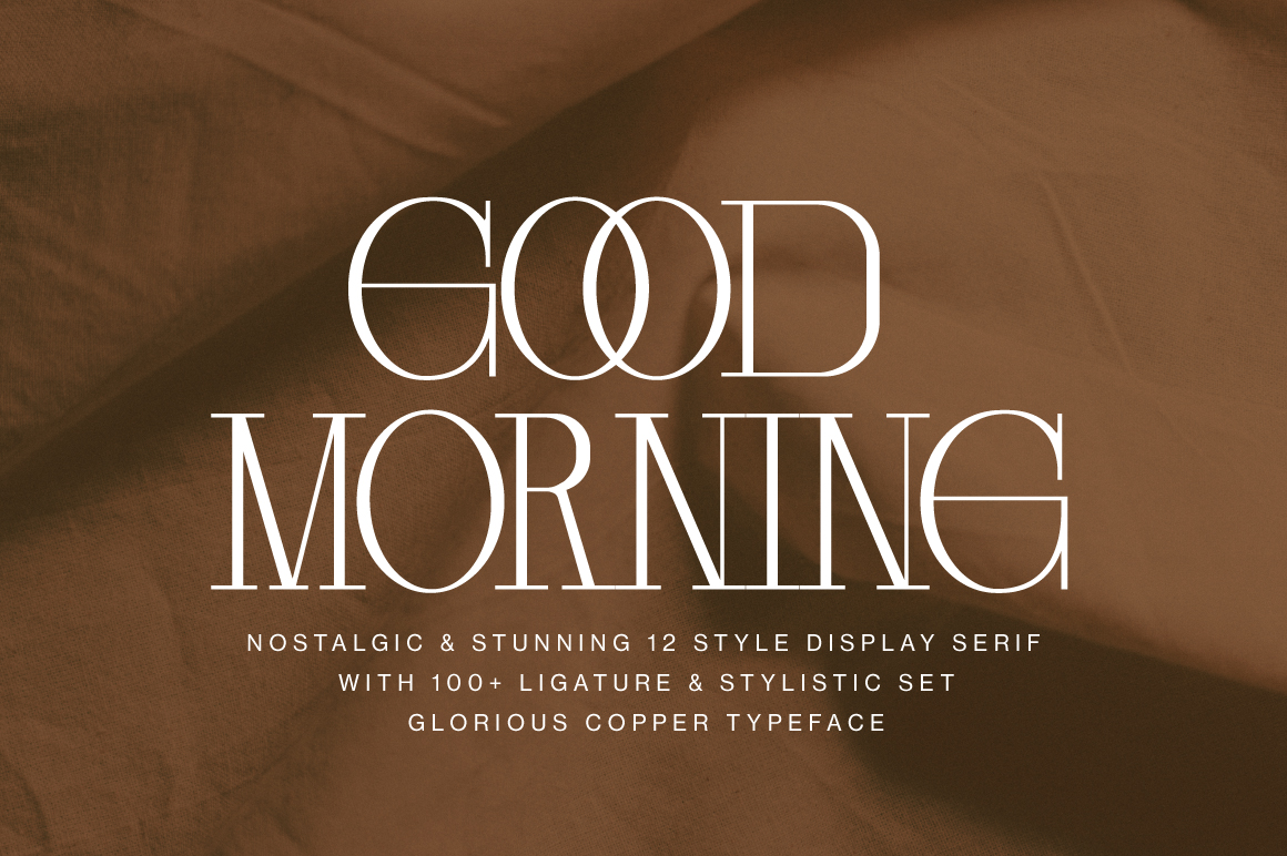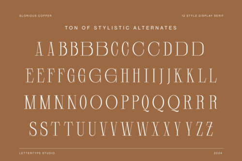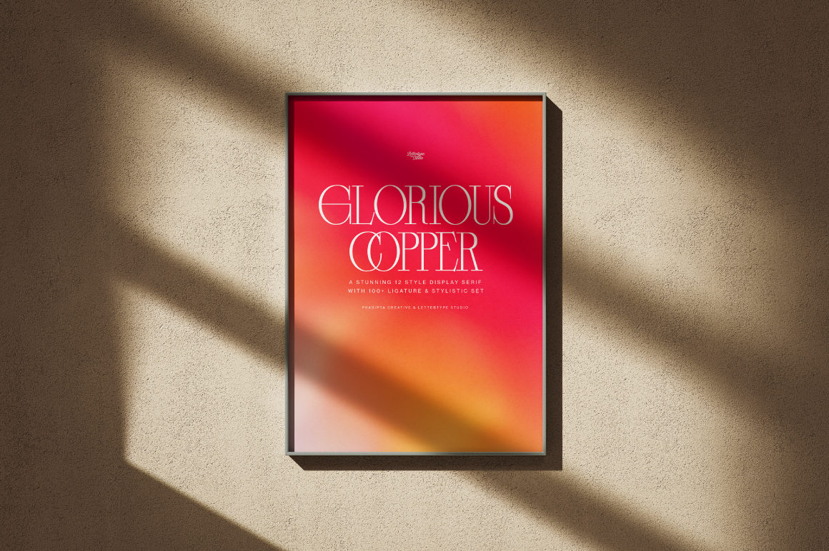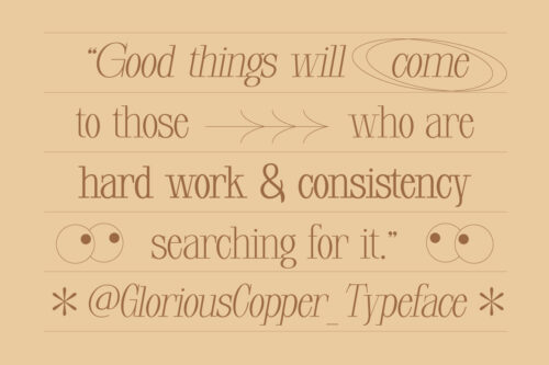 Glorious Copper is a nostalgic display serif font family featuring 12 distinct styles and over 100 ligatures and alternates. Inspired by vintage typography and timeless editorial aesthetics, it delivers a refined balance between elegance and bold retro charm.