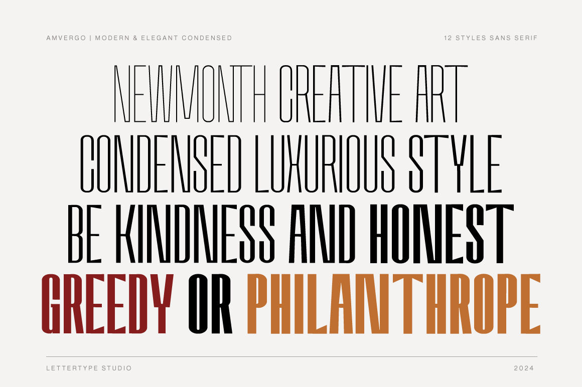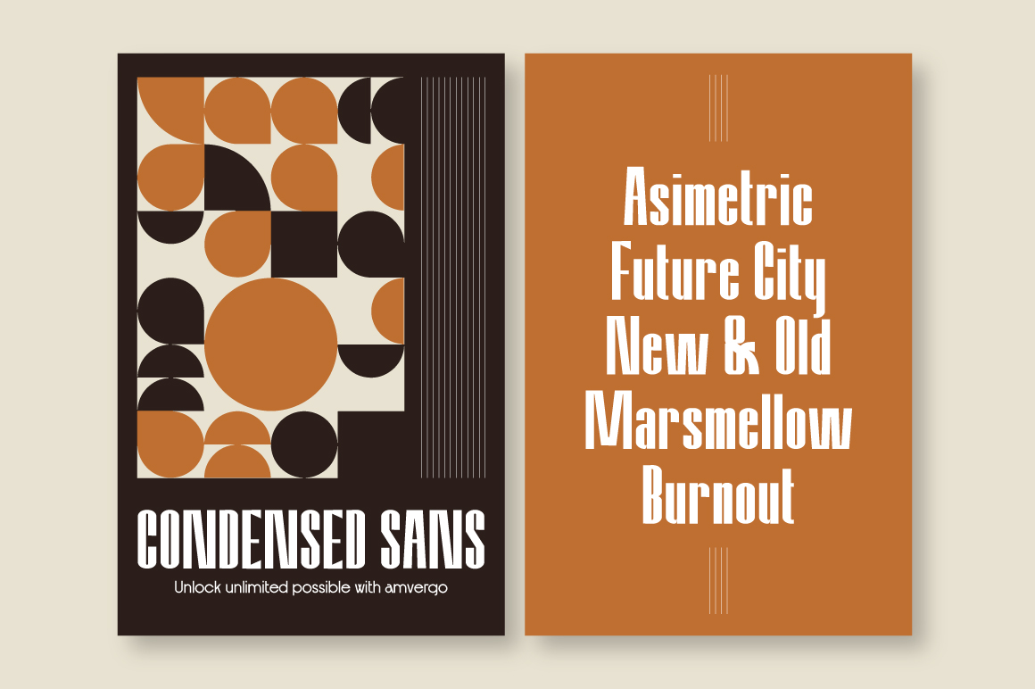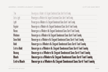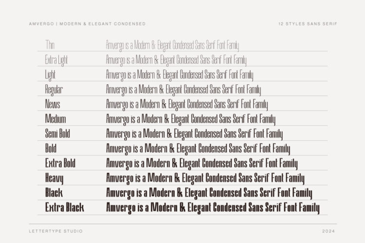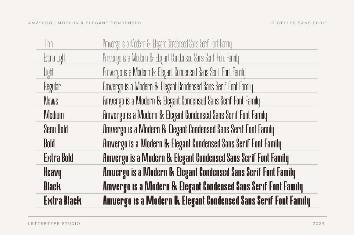 Amvergo is an elegant condensed sans serif font family designed for modern branding and editorial use. With its refined proportions and geometric balance, it delivers a professional, stylish, and confident look that stands out in both print and digital media.