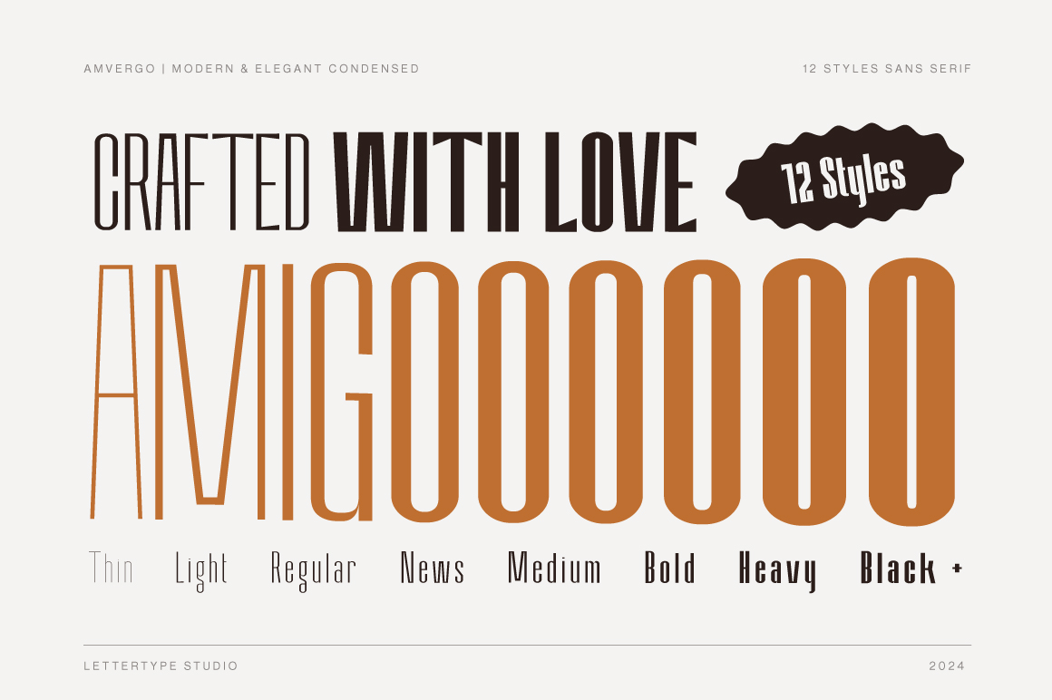 Featuring 12 styles from Thin to Extra Black, Amvergo offers flexibility and sophistication for headlines, magazines, and corporate identities. Its clean lines and timeless appeal make it a go-to font for designers who value minimalism and visual precision.