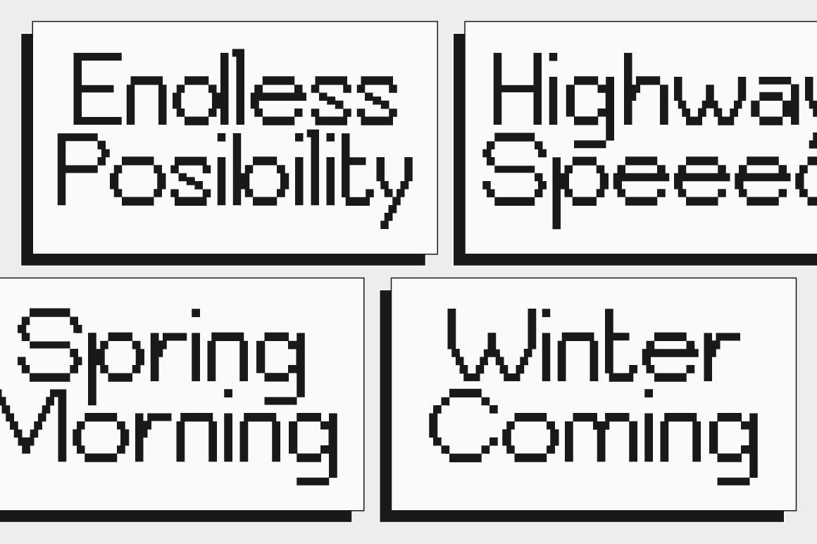 Bitend is a geometric pixel Y2K font that fuses 80s retro nostalgia with early 2000s futuristic style. Designed for bold, digital-forward projects, it’s ideal for gaming interfaces, posters, and branding that needs a sharp, tech-inspired edge.
