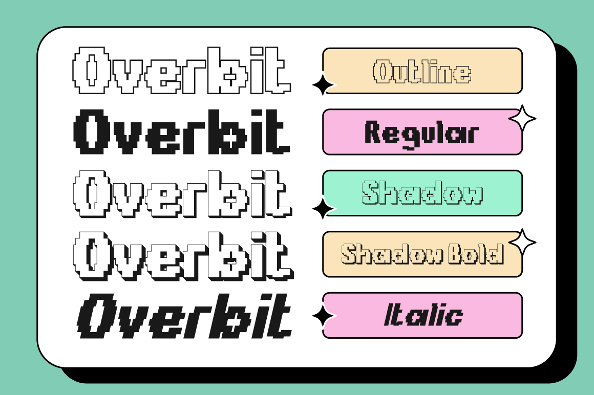 Overbit is a bold pixel Y2K display font that merges retro 80s video game energy with early 2000s futuristic flair. With five distinct styles â Regular, Outline, Italic, Shadow, and Shadow Bold â it offers versatility and personality for a wide range of creative projects.