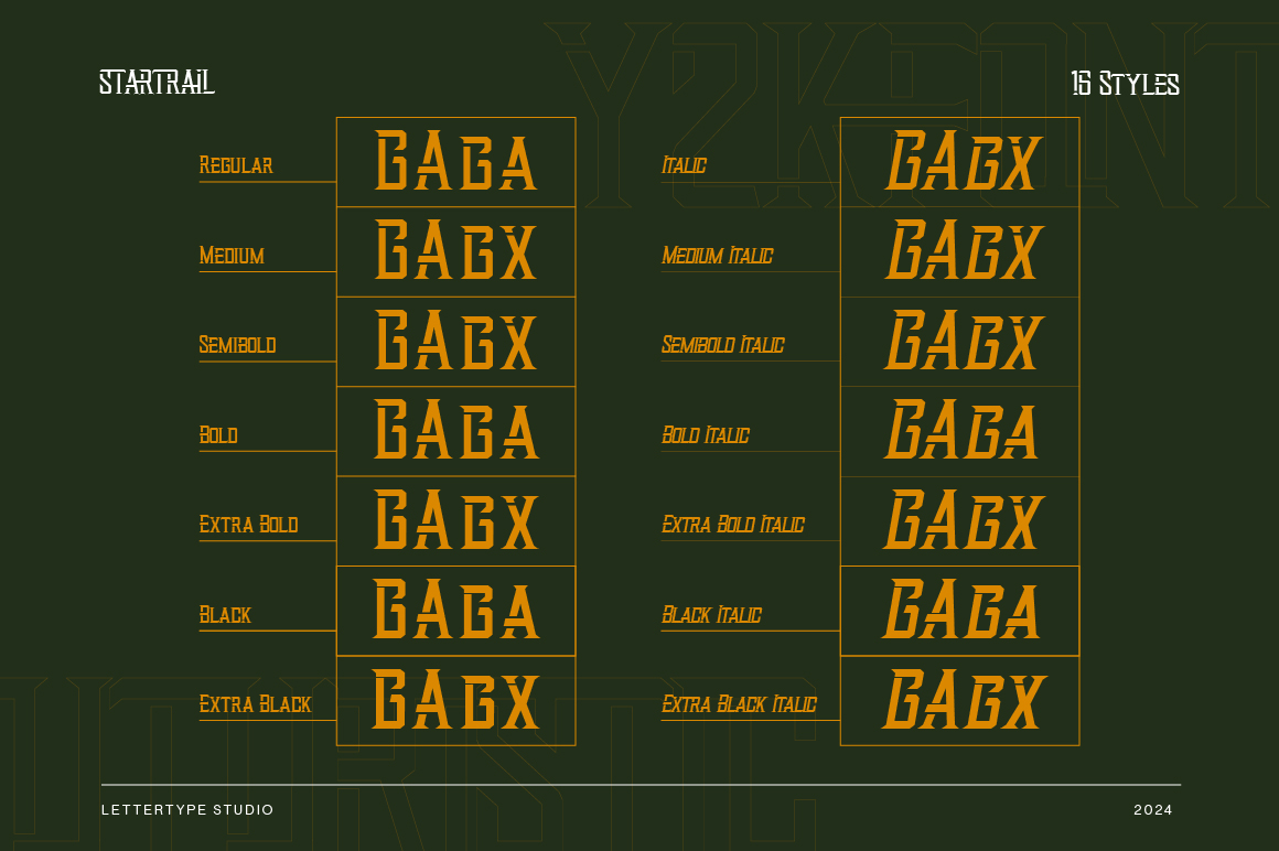 Startrail is a Y2K-inspired serif font family that fuses classic elegance with futuristic energy. Designed to capture the digital optimism of the late 1990s and early 2000s, it features exaggerated serifs and expressive details that radiate style and nostalgia.
